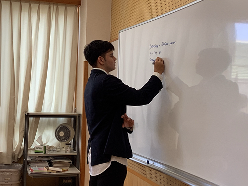 ウクライナの留学生との交流会が行われました。昨年から日本で暮らしている16歳のイリア君が来校し、国際科3年A組のクラスで英語の授業を体験してもらいました。総合的な探究の時間では、お互いのことを知るために、好きな食べ物やスポーツなどの質疑応答が行われました。イリア君から母国語を学ぶ機会もあり、とても有意義な時間を過ごすことができました。