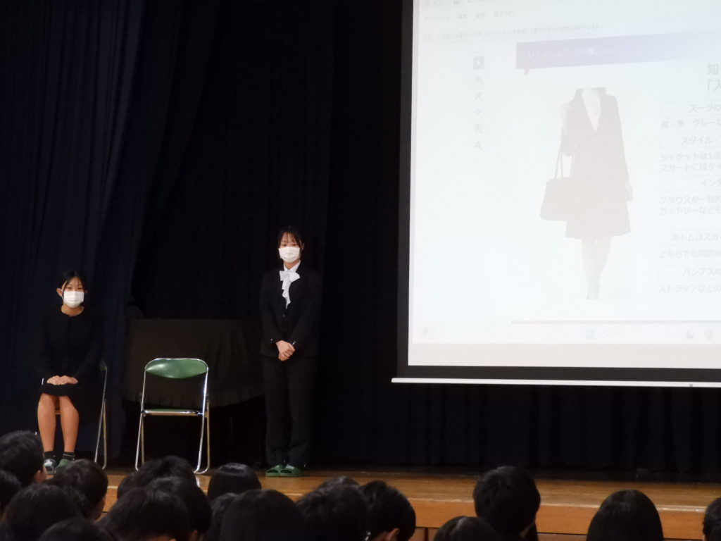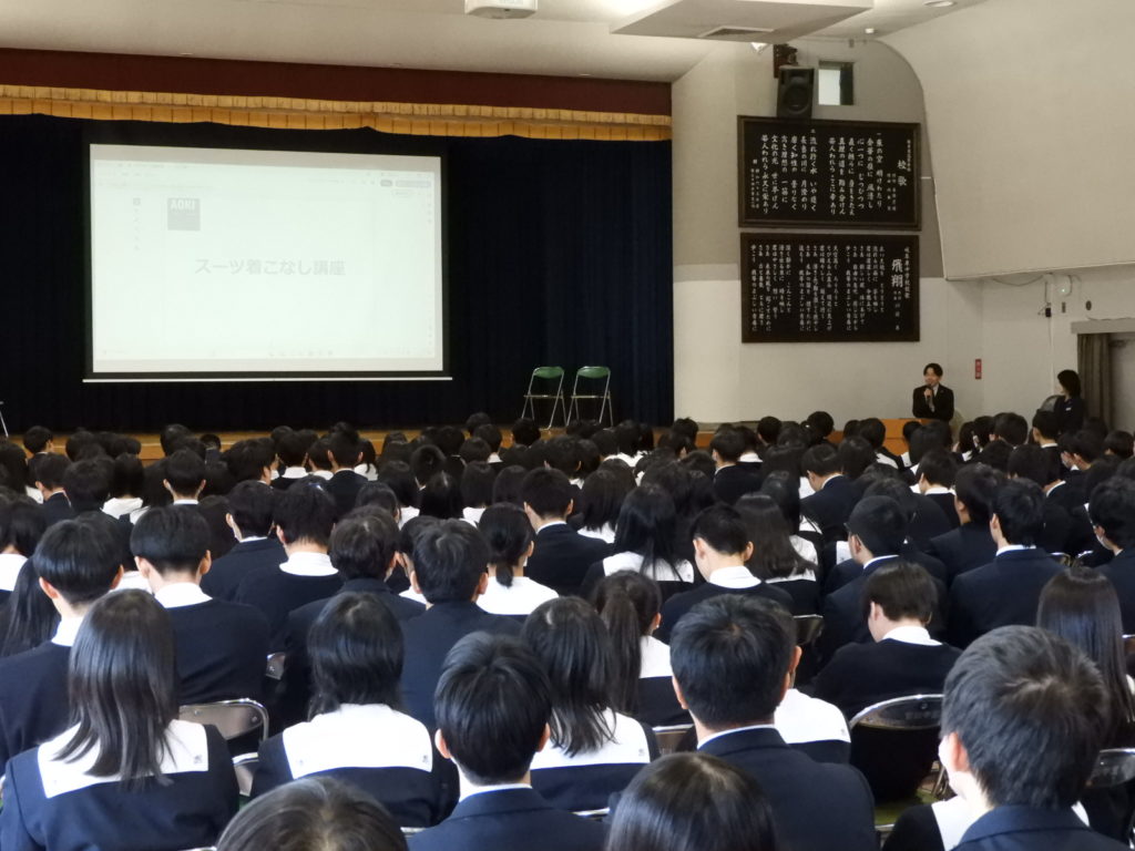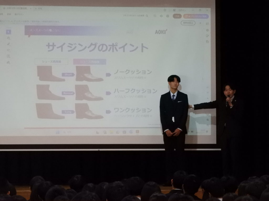 3年生を対象にAOKI各務原店の川添様にお越しいただき、「社会人マナー講座」が行われました。