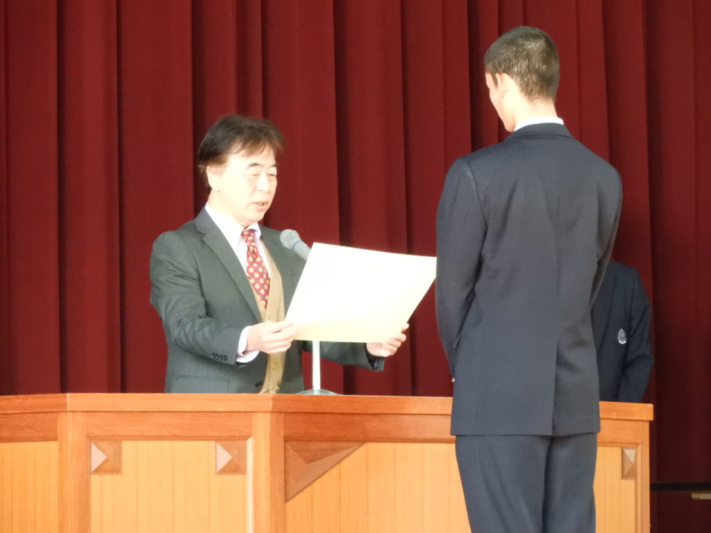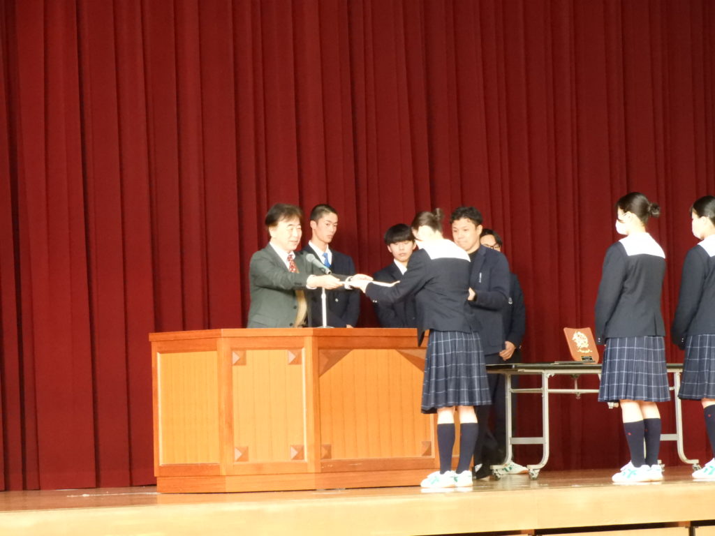 学校長式辞と生徒指導部長の講話があり、表彰があった部活動や個人の表彰披露がありました。